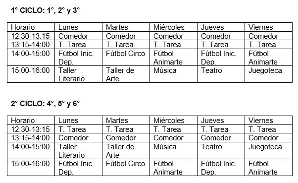 El Espacio Talleres 2026 se renueva para ofrecer más experiencias educativas diversas y formativas en ámbitos deportivos y artísticos. El horario del espacio se extiende hasta las 16: 00 hs y se podrá optar por una pos hora hasta las 17 : 00 hs.
